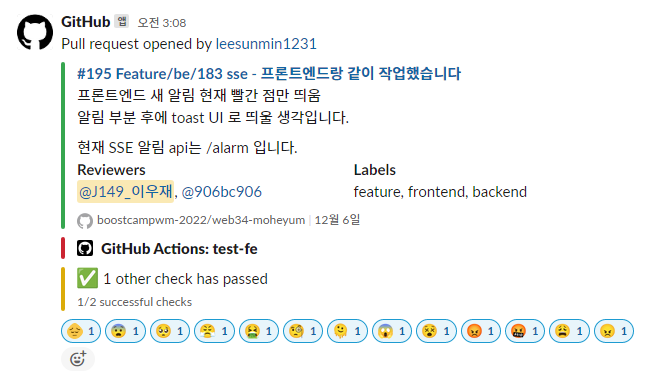 가장 큰 문제였다. 앞서 언급했듯 우리 팀은 프로젝트의 모든 코드를, 모두가 책임지는 것을 최우선으로 여겼다. 이는 내가 백엔드 코드를 읽어야 하는 문제 뿐 아니라, 내가 백엔드 작업을 하는 주간에 올라오는 프론트 PR에도 똑같이 적용되었어야 하는 문제였다. 따라서 우리는 PR을 올릴 때 리뷰어로 서로를 지정하고, approve 되어야 dev 브랜치에 머지할 수 있도록 하자고 이야기했지만 그렇지 않았다.