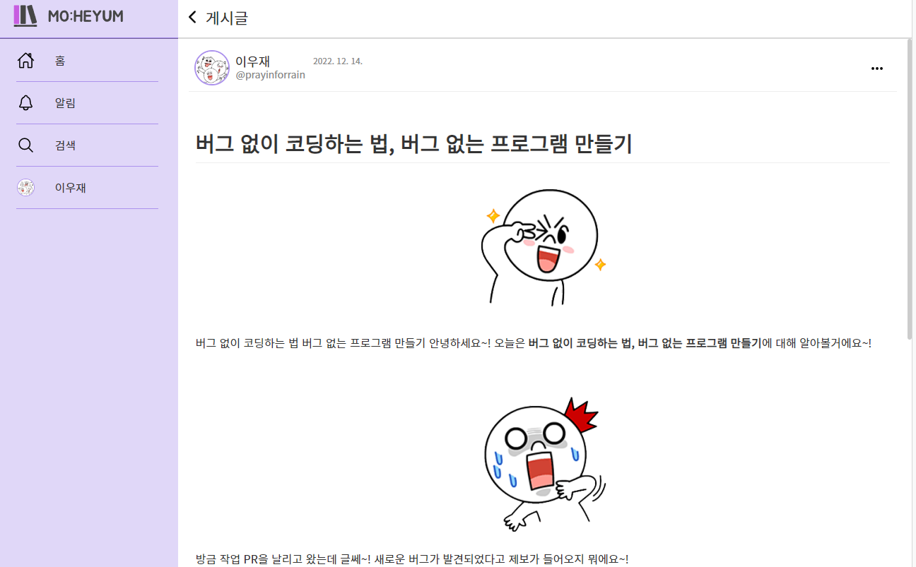 부스트캠프의 최종 팀 프로젝트로 나는 모헤윰이라는 SNS를 만들었다. 결과물은 꽤 괜찮다. [여기]에 간단한 시연 영상이 있다. 사실 팀 구인을 하던 때부터 나는 무엇을 만드는지는 크게 중요하지 않았다. 여태까지의 학습 스프린트로 이미 개발이라는 과정은 어느정도 감을 익혔고, 내가 성장함에 따라 이 과정에서 사용하는 기술만 조금씩 변화할 뿐이라고 생각했다. 따라서 내가 팀 프로젝트에서 가장 중요하게 생각했던 포인트는 협업이었다.